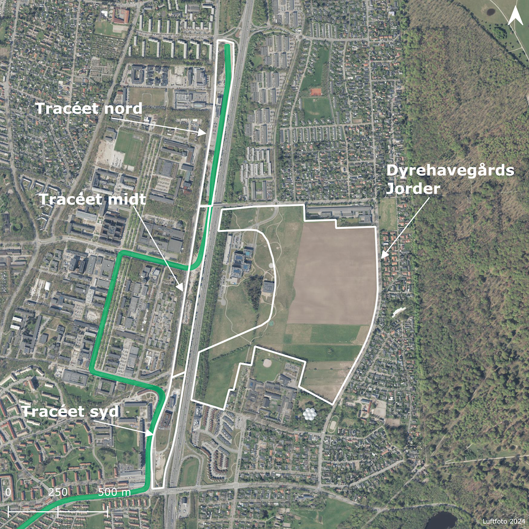 Af kortet fremgår letbanen samt områderne Dyrehavegårds Jorder og Tracéet langs Helsingørmotorvejen opdelt i tracéet nord, midt og syd.
