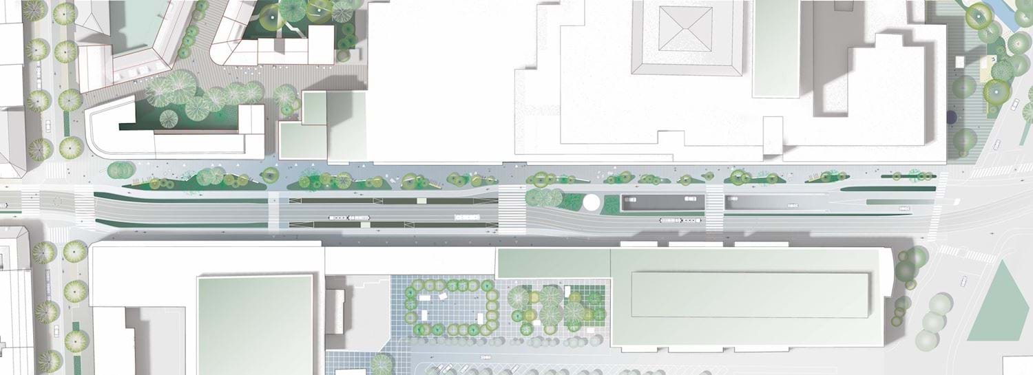 Klampenborgvej skal ændres fra et vejrum til et egentligt byrum. Byrummet er en af de to hovedakser og lede op til hele byens rådhus og Lyngby Torv som en boulevard.