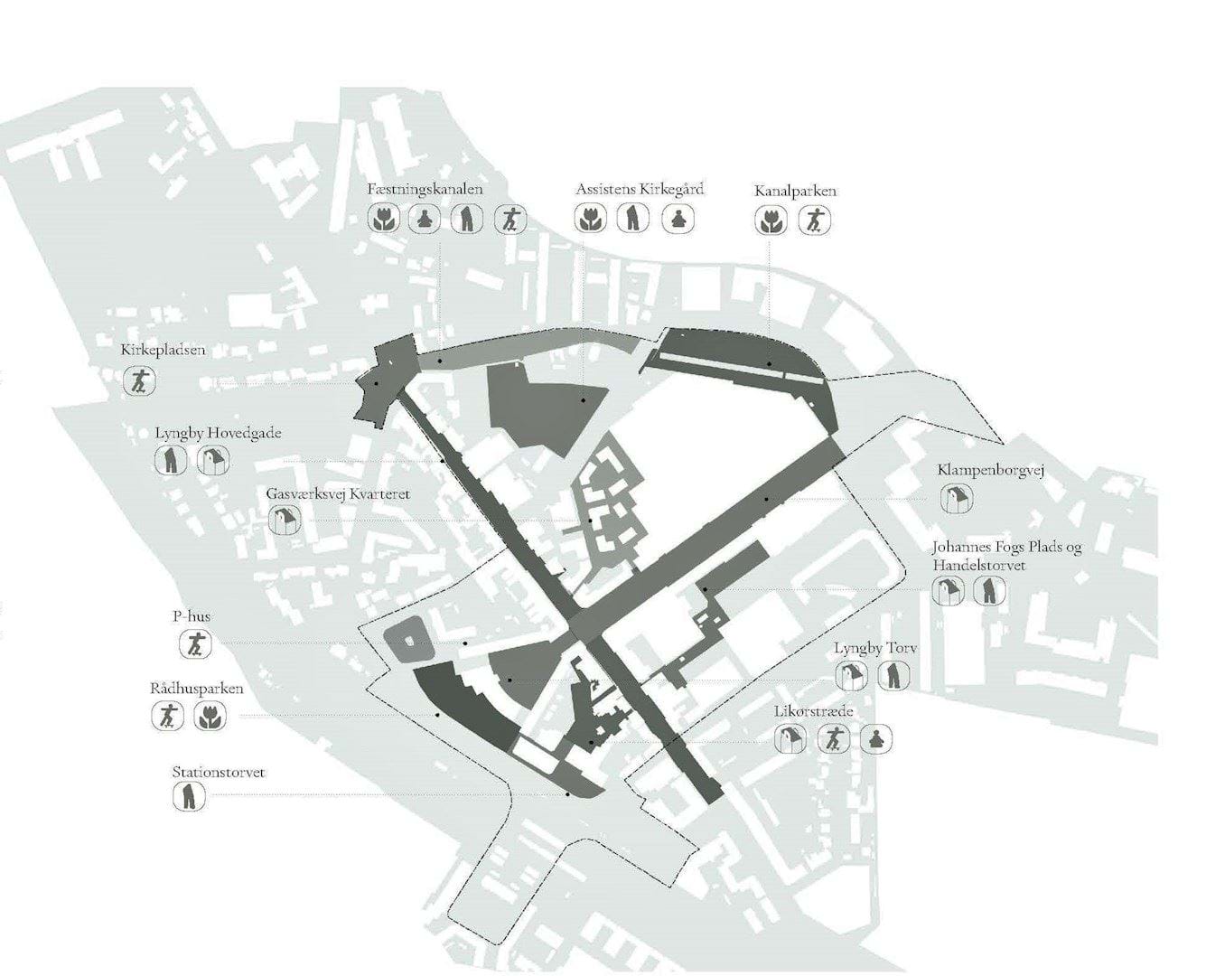 Byens rum skal tilsammen danne en vifte af oplevelser, som kan imødekomme og rumme de mange forskellige målgrupper og generationer, som besøger og bruger Kongens Lyngby Centrum. Indretningen af byrummene skal bygge på stedernes identitet samt historie, og samtidig skabe rum til nye mødesteder og fællesskaber, som kan fungere med byens varierende puls hen over dagen og året.