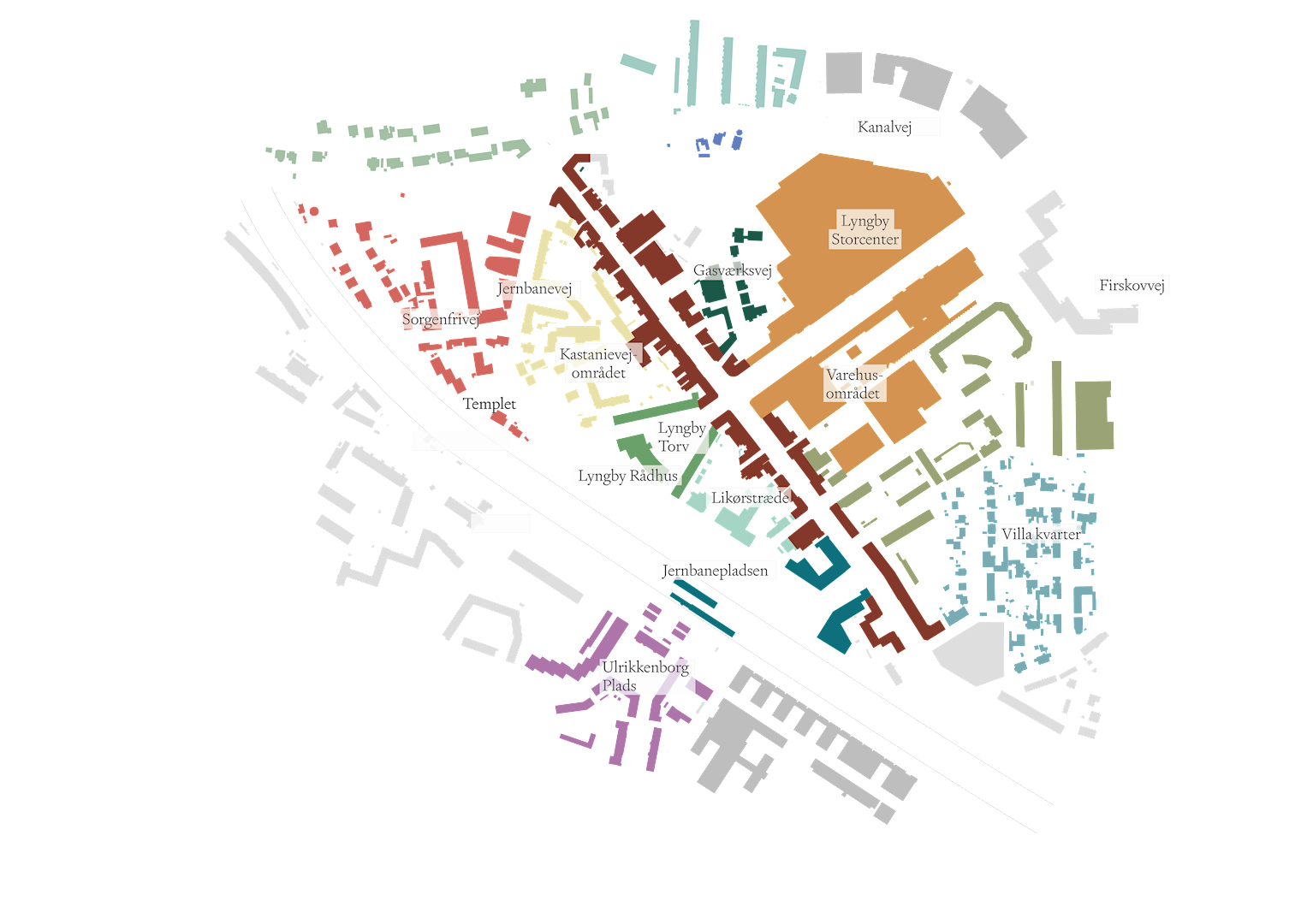 Hver især har de muligheder for udvikling, for mere tætte byrum og lokale tiltag med aktive stueplaner og anvendelser, som komplementerer de store handelsgader og varehuse, og bidrager til at understøtte bylivet - også efter butikkernes lukketid. Der er også mulighed for bymæssige fortætninger hvor Gasværksvejområdet, Kastanievej og Jernbanepladsen ses som de tre mest centrale områder. Fælles for disse tre områder er, at de ligger imellem Lyngby Hovedgades fine skala, og den større skala i Lyngby Storcenter og omfartsvejen/stationen. Bebyggelser og byrum i disse områder må således forholde sig til, og formidle, en overgang i skala og karakter.
